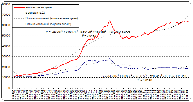На нижеследующем графике (Рис.1) представлена средняя удельная цена предложения квартир на вторичном рынке Ростова-на-Дону – номинальная цена, в виде красной линии. Синяя линия отражает реальную цену (в ценах января 2002 года) – то есть среднюю удельную цену, скорректированную на показатель инфляции, в качестве которого был выбран индекс потребительских цен (ИПЦ). ИПЦ является одним из основных показателей инфляции и отражает процентное изменение цен товаров, составляющих потребительскую корзину[3].