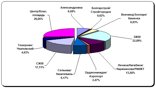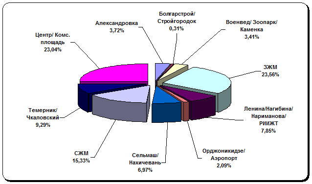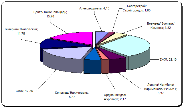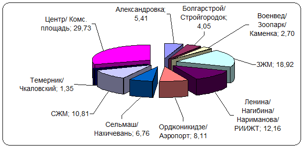Завершающим этапом исследования рынка купли-продажи жилья стал анализ структуры спроса с разбивкой по микрорайонам, результаты которого приведены на графике 15.