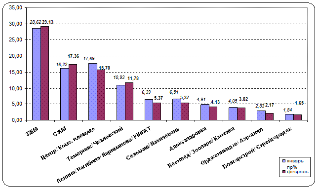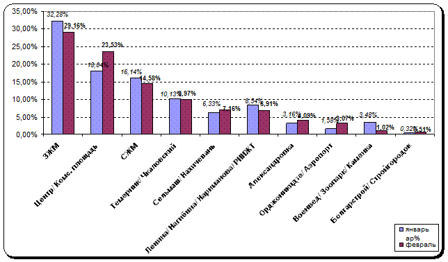 Район ЗЖМ в феврале 2013 г. на втором месте – 18,92% от общего числа заявок. На третьем месте в феврале 2014 г. район Ленина/Нагибина/Нариманова/РИИЖТ – его доля в общем объёме заявок на аренду квартир составляет 12,16%.