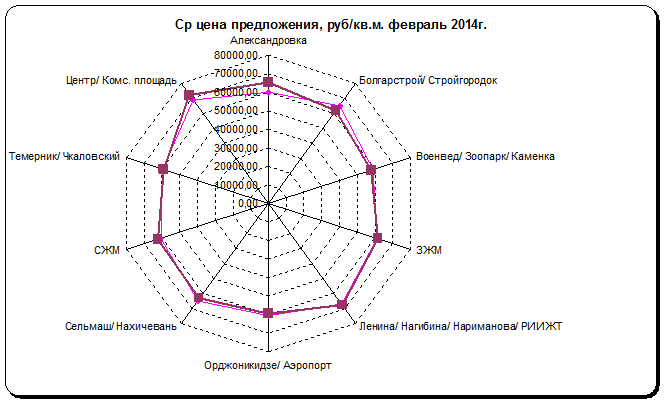 Средняя цена предложения 1 квадратного метра в феврале 2014 г. в целом по городу составила 63768 руб./кв. м., что на 681 руб. и на (+1,08%) выше аналогичной цены января 2014 г.