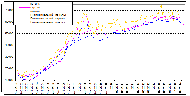 В панельных домах средняя цена предложения февраля 2014 г. составила 62239 руб./кв. м. (в январе 62505 руб. 1 кв. м.), в домах кирпичной постройки в феврале 2014 г. – 64315 руб./кв. м. (в январе 63173 руб./кв. м.). В феврале 2014 г., средние удельные цены предложения 1 кв. м. в монолитно-каркасных домах выросли, составив 66834 руб./кв. м. (в январе 65372 руб./кв. м.).