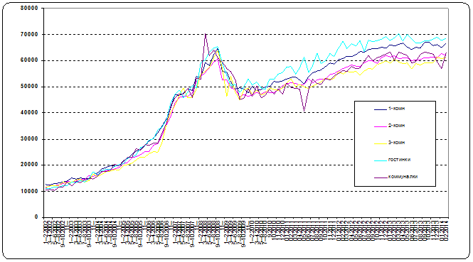 Далее рассматривается динамика средней цены предложения квартир в разбивке по количеству комнат за период с января 2002 г. по февраль 201 4 г., вне зависимости от местоположения объекта, предлагаемого на продажу. Данные отображены на графике 9.