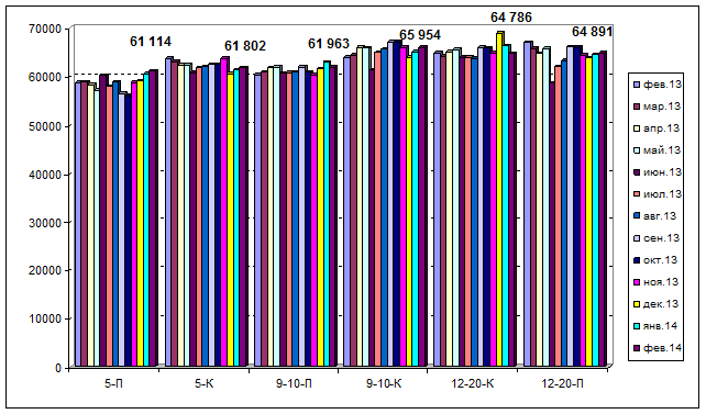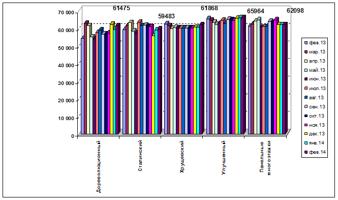 На графике 12 изображена динамика средней цены предложения 1 кв. м. в квартирах различных типов жилого фонда за годовой период – с февраля 2013 по февраль 2014 года.