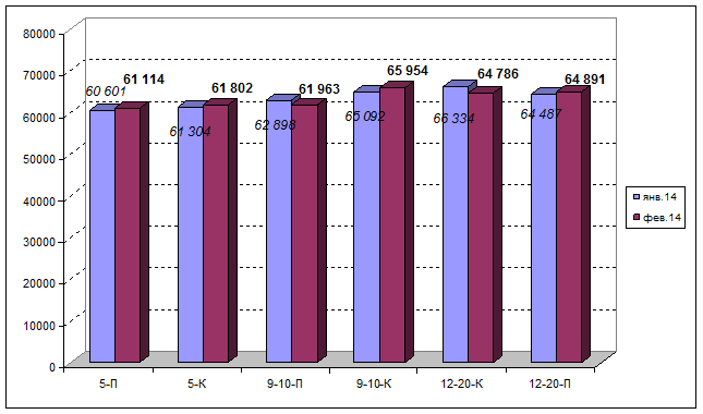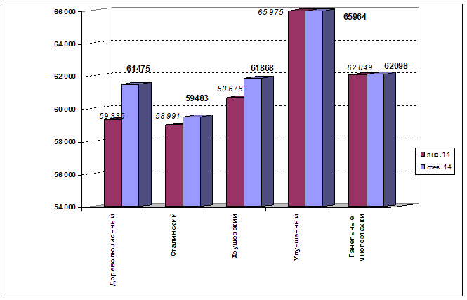 Самые дорогие квартиры (исключая элитные дома, учитывая их относительно небольшую долю в общем объёме предложения) в феврале 2014 г., предлагались к продаже в улучшенном жилом фонде – 65964 руб./кв. м. Для наглядности ниже представлен график 12.1, на котором отображена динамика средней цены предложения по типам фонда в феврале 2014 г. в сравнении с январем 2014 г.
