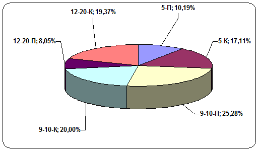 Следующий график отображает процентное соотношение предлагаемых к продаже квартир в вышеперечисленных группах в отчётном месяце.