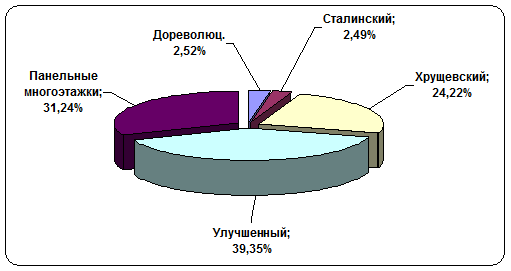 Большинство квартир, предлагаемых к продаже в феврале 2013 г., как и в предыдущем месяце, являются квартирами в улучшенном жилом фонде – 39,35%. Квартиры в панельных многоэтажках в феврале 2014 г. на втором месте – 31,24% от общего количества предложений. Меньше предложений приходится на «хрущевки» - 24,22%. Далее с большим отрывом идут квартиры в домах “сталинской” постройки – 2,49% и квартиры в дореволюционном жилом фонде – 2,52%.