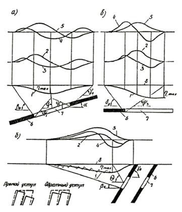а - вертикальный разрез вкрест простирания при наклонном залегании угольных пластов; б - то же, при крутом залегании угольных пластов; в - вертикальный разрез по простиранию пластов; 1 - кривые оседаний; 2 - эпюры наклонов; 3 - эпюры кривизны; 4 - эпюры относительных горизонтальных деформаций; 5 - эпюры горизонтальных сдвижений; 6 - пласт; 7 - очистная выработка; 8 - положение земной поверхности до подработки; hmax - максимальное оседание земной поверхности; b0, g0, d0 - граничные углы сдвижения; y1, y2, y3 - углы полных сдвижений; q - угол максимального оседания; a - угол падения пласта