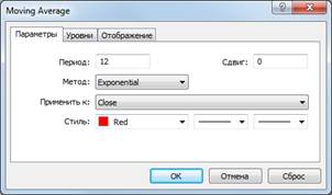 - экспоненциальная скользящая средняя MA - период Р1, применить к Close, цвет красный,