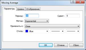 - экспоненциальная скользящая средняя MA - период Р2, применить к Close, цвет темно-синий.