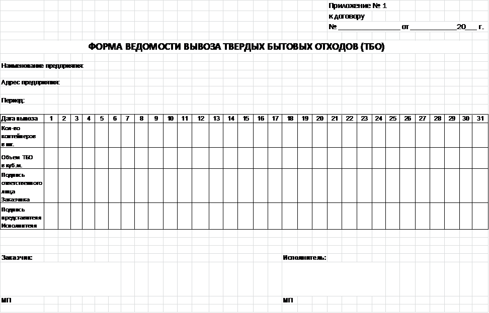 Приложение 1 – Форма ведомости вывоза ТБО – на 1 листе.