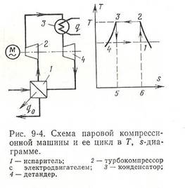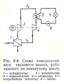 Схема теплового насоса, работающего по замкнутому циклу (рис. 9-8), принципиально ничем не отличается от схемы паровой компрессионной холодильной установки.