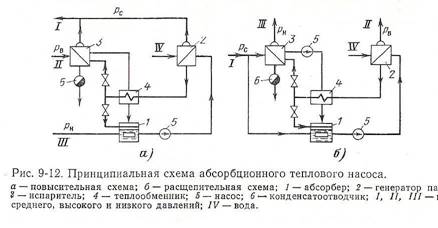 Абсорбционные тепловые насосы, так же как и компрессионные тепловые насосы, могут работать по повысительной и расщепительной схемам (рис. 9-12).