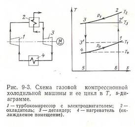 Газовые компрессионные холодильные машины. В воздушных холодильных машинах получение низких температур осуществляется за счет адиабатного расширения воздуха при совершении внешней работы. Схема работы воздушной холодильной машины приведена на рис. 9-3.