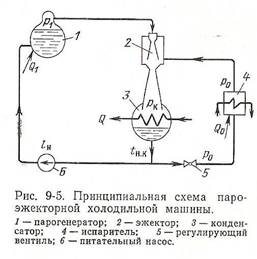 Струйные ( пароэжекторные) холодильные машины. Особенность пароэжекторной холодильной машины состоит в том, что для ее работы используется кинетическая энергия струи рабочего пара. В этих машинах в качестве хладоагента обычно применяют воду. Принципиальная схема пароэжекторной холодильной установки приведена на рис. 9-5.