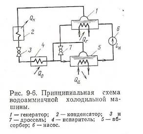 Водоаммиачная абсорбционная машина работает на растворе, в котором аммиак является холодильным агентом, а вода – абсорбентом. Принципиальная схема водоаммиачной холодильной машины приведена на рис. 9-6.