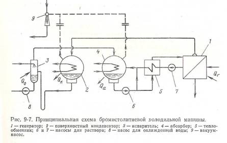 Охлажденная вода из испарителя насосом 8 подается к потребителю холода, а образующийся пар поступает в абсорбер и поглощается раствором бромистого лития.