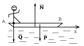 На одном конце лодки, находящейся в покое, в точке А стоит человек, он переходит затем на другой её конец в точку В. Определить, пренебрегая сопротивлением воды, на какое расстояние передвинется при этом лодка, если вес лодки равен Р, вес человека равен Q.