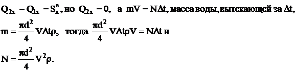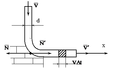Определить горизонтальную составляющую N возникающего при движении воды давления на опору колена трубы диаметром d, по которой течет вода со скоростью V. Плотность воды – r.