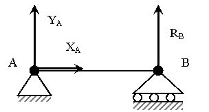 Опора А называется шарнирно-неподвижной и имеет две составляющие опорной реакции, опора В называется шарнирно подвижной и имеет одну составляющую, направленную перпендикулярно опорной поверхности.