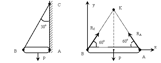 (рис. 7). Реакция нити ВС направлена по нити, а реакция шарнира А определяется в соответствии с теоремой о трех силах: если свободное твердое тело находится в равновесии под действием трех непараллельных сил, лежащих в одной плоскости, то линии действия этих сил пересекаются в одной точке. Заменив действие связей их реакциями, мы можем перейти от реальной схемы нагружения к расчетной (рис. 7, а). Учитывая, что сила Р приложена в середине балки и следовательно точка К (точка пересечения сил), делит отрезок ВС пополам, определим углы в полученной фигуре. Решение данной задачи может быть проведено двумя методами: геометрическим и аналитическим.