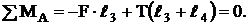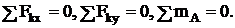 При решении задач на плоскую систему сил пользуются уравнениями равновесия. Для равновесия плоской системы сил необходимо и достаточно, чтобы сумма проекций этих сил на две координатные оси и сумма моментов относительно произвольно выбранной точки равнялись нулю