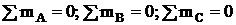 Третья форма: для равновесия произвольной плоской системы сил необходимо и достаточно, чтобы суммы моментов всех этих сил относительной любых трех центров А, В и С, не лежащих на одной прямой, были равны нулю.
