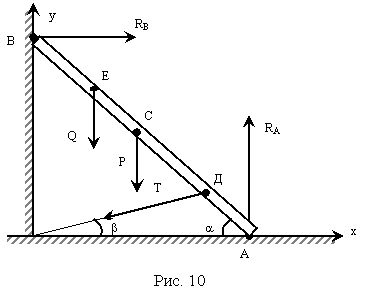 Решение: Используя принцип освобождаемости от связей, убираем связи, а их действие заменяем соответствующими реакциями. Составляем уравнения равновесия. Оси координат указаны на рис. 10.
