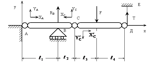 Решение: Используя принцип освобождаемости от связей, заменим действие связей соответствующими реакциями. Реакцию в шарнире А представим в виде двух составляющих XA и YA . Реакцию подвижной опоры обозначим RB , а реакцию нити – Т. В шарнире С разделим балку на два тела: стержень АС и стержень СД и для каждого участка в точке С обозначим равнодействующую внутренних сил в виде XC , YC и