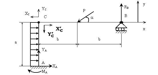 Решение: Стержневая конструкция состоит из двух частей АС и ВС. Используя принцип освобождаемости от связей, заменим опоры их реакциями. Для жестко защемленной опоры А имеем три составляющих опорной реакции, для шарнирно подвижной опоры В – одну опорную реакцию. В точке разделения конструкции С имеем по две составляющих (для каждого участка) реакций внутренних связей, который будут попарно равны по модулю и противоположны по направлению.