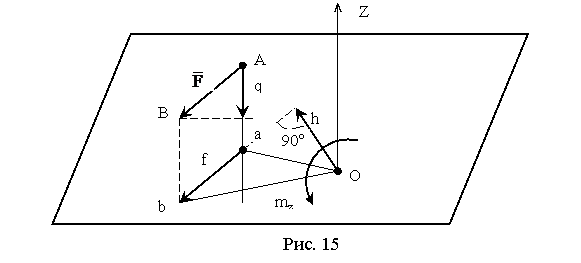 Пусть известна сила F, произвольно расположенная в пространстве. Разложим эту силу на две составляющие: одну параллельную оси Z, и другую f, лежащую на плоскости перпендикулярной оси Z. Опустим перпендикуляр на линию действия силы f и обозначим его h (рис. 15). Мерой вращательного эффекта, создаваемого силой f, будет служить момент силы относительно точки пересечения оси Z с плоскостью. Следовательно, величиной момента силы будет являться взятое с соответствующим знаком произведение mz = ±f∙h.