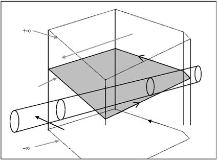 Необходимо подчеркнуть, что все вышесказанное применяется к пространственному объекту любого типа (включая те объекты, что используются для зафиксированного пространства вокруг здания и инженерных сооружений, или для сервитутов). Чтобы создать необходимую организацию элементов, вводится концепция слоя. Это особенно важно для пространственных объектов на основе топологии. Но это же можно применять и к другим типам объектов. Например, может быть базовый слой (Слой 1), на котором располагаются принадлежащие кому-либо пространственные объекты, определенные через топологию, и дополнительный слой (Слой 2) с пространственным объектом-полигоном, представляющим собой сервитут. Концепцию слоев можно также использовать в других ситуациях. Например, Слой 1 для данного владельца и Слой 2 для лиц, владевших объектом перед войной. Пример в 3-мерном изображении выглядит так: Слой 1 содержит право собственности (пороговые в 2D и топологические 3D пространственные объекты) и Слой 2 будет содержать право владения «юридическим пространством» вокруг инженерных сетей пересекающих большое количество других пространственных объектов (из которых можно выделить эти инженерные сети), см. рис. Е.1