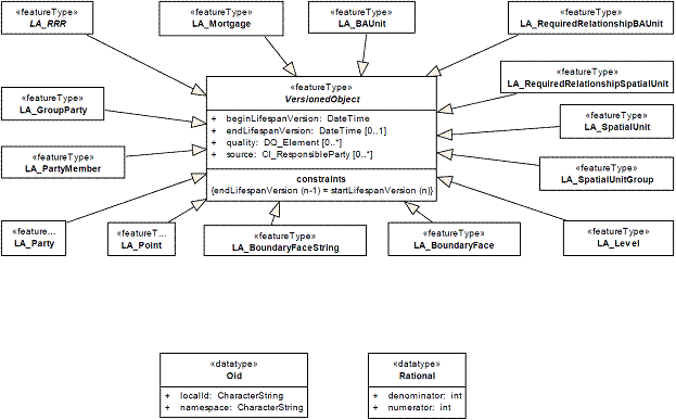Все классы LADM сцеплены со стереотипным классом featureType стандарта ISO/TS 19103. Многие классы LADM являются подклассами класса VersionedObject («Объект-версия») (см. 6.2.1).