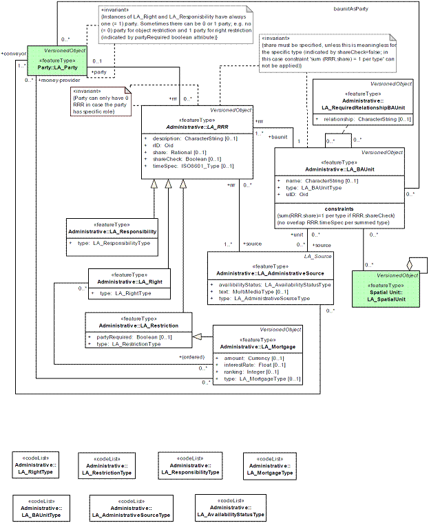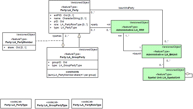 Представителем класса LA_Party является субъект. LA_Party ассоциируется с нулем или большим количеством [0..*] представителей подкласса LA_RRR. LA_Party также ассоциирован с LA_BAUnit, чтобы учесть тот факт, что объект недвижимости может быть субъектом (например, объект недвижимости содержит в себе сервитут на территории другого объекта недвижимости); см: рис. 9.