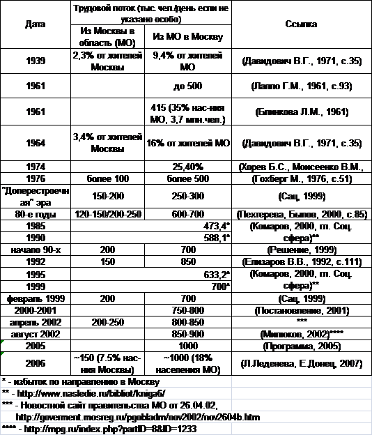 Во втором разделе главы (1.2) систематизированы результаты прикладных исследований МТМ, представленные в научной литературе. Прежде всего, основное внимание уделяется анализу результатов исследований основных показателей МТМ в московской агломерации, ее динамике в 20-ом веке, роли МТМ в концепциях развития Подмосковья. В Таблице 1 сведены оценки МТМ в Московском регионе за ряд лет из различных источников. В целом, несмотря на широкий разброс оценок МТМ между Москвой и областью, нельзя не отметить три основных момента: