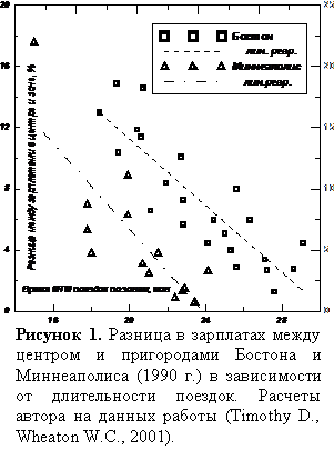 В случаях явно выраженной моноцентрической агломерации, к которой относится и Подмосковье, пространственные картины МТМ упрощаются и сводятся к радиальным градиентам связанных с ними показателей, наблюдавшихся в ряде исследований. Прежде всего, речь идет об ожидаемой отрицательной корреляции доли МТМ и заработной платы в агломерации при удалении от центра к периферии. В частности, расчет по американским агломерациям (Рис. 1) подтверждает вторую гипотезу. Fuchs-Schündeln и Izem (2007) обнаружили прямую взаимосвязь между уровнем безработицы и доступностью работы МТМ в Германии.