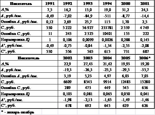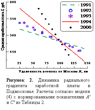 Параметры модели (4) определяются при помощи регрессионного анализа заработной платы за определенный год в разрезе районов. При этом коэффициент A – удельная скорость снижения заработной платы на единицу удаления региона от центра – отражает степень дифференциации заработной платы в мегаполисе. Поскольку коэффициент A имеет размерность руб./км, для исключения инфляционной рассчитываются величины A’ и С’, нормированные относительно показателей первого исследуемого года.