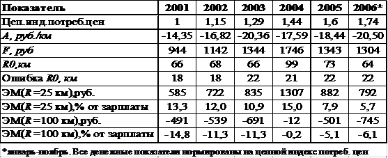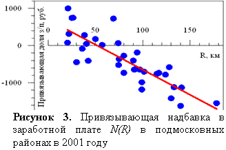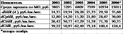 Характеристический параметр R0 является границей "нулевого эффекта мегаполиса". Работники регионов, расположенных внутри (вне) кольца R < R0 вокруг Москвы, имеют положительную (отрицательную) добавку к зарплате за счет эффекта мегаполиса. Динамика «эффекта мегаполиса» и его границы в гг. представлены в Таблице 3. Из нее следует, что градиент привязывающей надбавки растет, граница «нулевого эффекта мегаполиса» находится в расстоянии R0 ~ 50-60 км. Как отмечалось нами в первой главе, подобные оценки преимущественного развития агломерации внутри 50-км зоны встречаются и в ряде других публикаций.