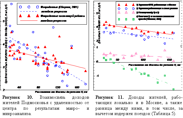 Раздел (6.6) посвящен анализу взаимосвязи МТМ с зарплатой. Регрессионный анализ микро-данных для поиска корреляции районной заработной платы с расстоянием до центра на основе модели (4) осуществлялся таким же образом, как и в макро-подходе (четвертая глава), а на Рис. 10 представлены результаты, полученные в обеих методиках. Из их сравнения видно, что качественно результаты близки друг другу, однако, при этом коэффициент эластичности A в (4) – наклон прямой – оказывается меньше в микроанализе. Причиной систематического занижения A является влияние обсуждавшихся ранее в пятой главе теневых доходов, влияние которых не удается исключить полностью.