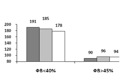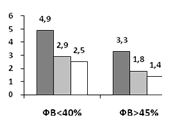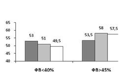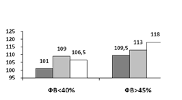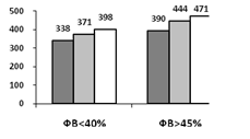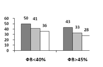Соответственно задачам исследования, все необходимые данные: клиническое течение заболевания, нейрогуморальный статус, данные радиоизотопных методик, изучали раздельно у 2 групп пациентов, первую из которых (1 группа) составили больные со сниженной ФВ ЛЖ < 40%, вторую (2 группа) – с сохраненной ФВ ЛЖ > 45% и оценивали через 6 и 12 месяцев после процедуры ТБКА со стентированием КА.
