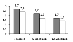 Стандартная лекарственная терапия проводилась, согласно Российским и международным рекомендациям по лечению ИБС и ХСН, которая достоверно не менялась в течение всего периода наблюдения. Длительность наблюдения составила 12 месяцев.