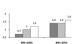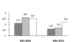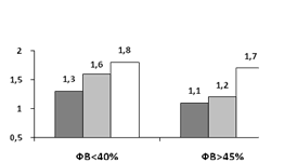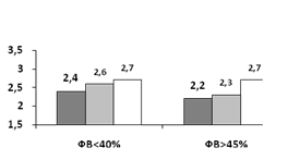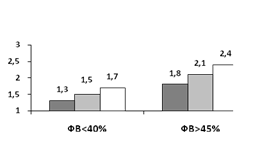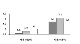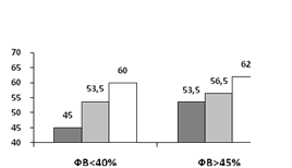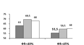 После проведения ТБКА со стентированием достоверного повышения ФВ и УО ЛЖ и существенной динамики КДО и КСО у больных со сниженной ФВ ЛЖ, в целом по группе, не наблюдалось, в отличие от пациентов с сохраненной ФВ ЛЖ, у которых отмечалось достоверное повышение УО и ФВ ЛЖ в течение всего периода наблюдения (рис. 4).