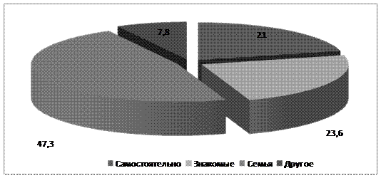 Каким образом искали работу? Помогли родители - ответили 47,3% опрошенных, самостоятельно – 21%, помогли друзья или знакомые – 23,6%, оставшиеся 7,8% пользовались другими способами, например, интернет.