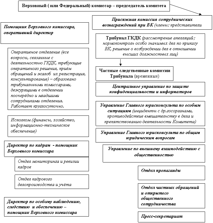 ВК подчиняется Президенту РФ в порядке ежемесячного информирования или доклада по требованию. Президент не вправе отдавать распоряжения или давать рекомендации ГКДК или иным образом вмешиваться в работу комитета.