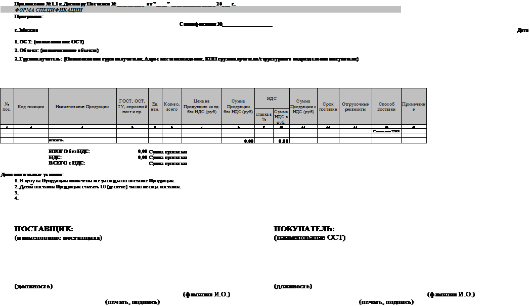 1.2. В Спецификациях по форме Приложения № 1 устанавливаются следующие условия поставки Продукции: