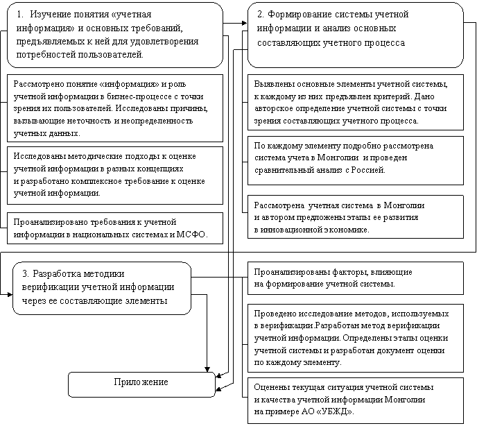 В диссертации представлены решения трех основных групп актуальных и значимых вопросов в сфере верификации учетной информации:изучение понятия«учетная информация» и основные требования, предъявляемые к учетной информации, для удовлетворения потребностей пользователей; формирование системы учетной информации и анализ основных составляющих учетного процесса; разработкаметодики верификации учетной информации через ее составляющие элементы и определение текущей ситуации развития системы учета в национальных моделях бухгалтерского учета на примере Монголии(рис. 1).