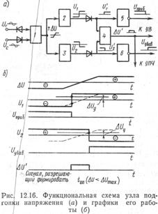 Узел подгонки напряжения (УПН) формирует сигнал, воздействующий на систему возбуждения генератора с целью подгонки его напряжения с заданной точностью к напряжению сети. Упрощенная функциональная схема и графики работы устройства показаны на рис. 12.16.