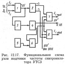 Узел подгонки частоты (УПЧ) формирует сигналы, воздействующие на регулятор числа оборотов турбины, и подгоняет частоту напряжения генератора с заданной точностью к частоте и фазе напряжения сети. Упрощенная функциональная схема УПЧ показана на рис. 12.17.
