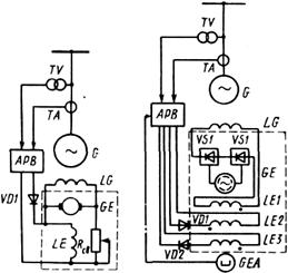 (рис. 12.18). В качестве возбудителя используется генератор постоянного тока GE с обмоткой возбуждения LE, включенной через реостат Rcв параллельно обмотке якоря по схеме самовозбуждения. При изменении тока в обмотке LE изменяется напряжение возбудителя, а следовательно, изменяется и ток в обмотке возбуждения LG синхронного генератора G, которая подключается к возбудителю с помощью колец и щеток. Ток в обмотке LE можно изменять путем изменения сопротивления реостата Rcв и за счет дополнительного тока, посылаемого устройством АРВ. Возбудитель обычно наряду с основной обмоткой возбуждения LE имеет дополнительные обмотки. В таком случае выход УАРВ подключается к этим обмоткам. В электромашинной системе возбуждения наряду с возбудителем может быть подвозбудитель. При этом основная обмотка возбуждения LE возбудителя подключается к подвозбудителю. Системы возбуждения с генераторами постоянного тока применяются на синхронных генераторах мощностью до 100 МВт. Эти ограничения связаны с трудностями изготовления электромашинного возбудителя постоянного тока требуемой мощности, которая составляет 0,4—0,6% и более от мощности турбогенератора [103]. Для быстроходных машин (турбогенераторов) эти трудности обусловлены невозможностью выполнить возбудитель с надежно работающим коллектором.