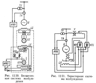 Тиристорная система возбуждения (рис. 12.21). Эта система для турбогенераторов выполняется по схеме самовозбуждения. Источником питания системы возбуждения служит специальный трансформатор Т, подключаемый к выводам генератора G. Иногда напряжение источника питания дополняют напряжением, пропорциональным току генератора. Для этой цели используют трансреактор TAV. В систему возбуждения входят два управляемых тиристорных выпрямителя. Один из них VST1 предназначен для форсировки возбуждения в аварийных режимах. К нему подводится полное напряжение источника питания, дополненное напряжением трансреактора. В нормальном режиме этот выпрямитель практически не действует. Для этих целей служит выпрямитель VST2. Он подключается к ответвлениям обмоток трансформатора с напряжением, не превышающим половины напряжения их выводах. При этом обеспечивается изменение тока возбуждения генератора в нормальных режимах работы от значения холостого хода до номинального значения. Выходы выпрямителей соединены параллельно и подключены к обмотке возбуждения LG генератора.