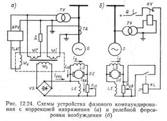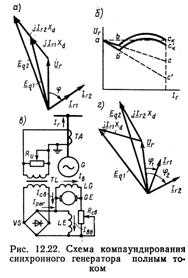 Фазовое компаундирование с коррекцией напряжения. Из рассмотрения векторной диаграммы (см. рис. 12.22, г) следует, что при неизменном токе Iг снижение напряжения происходит за счет увеличения реактивной составляющей тока Iг sin φ, поэтому для более точного регулирования Ur используется фазовое компаундирование с коррекцией напряжения, действующее в зависимости от абсолютных значений напряжения Ur, тока Iг и от угла φ сдвига фаз между ними.